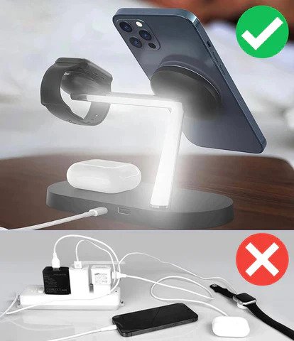 Нашата зарядна станция излиза извън рамките на обикновеното, като включва защитни функции, като откриване на чужди предмети, контрол на температурата, защита от препълване и защита от пренапрежение. С допълнителен USB порт за четвърто устройство като iPad можете да зареждате вертикално или хоризонтално за оптимални ъгли по време на възпроизвеждане на видео или гледане на филми.