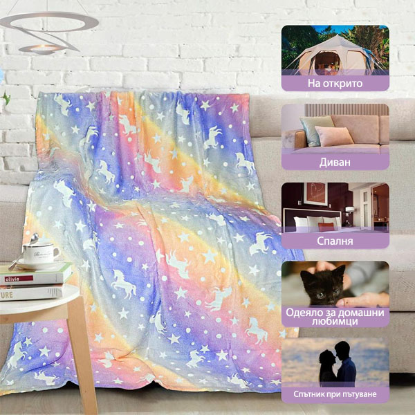 Уютно и топло одеяло излъчва светлина през нощта! Можете да изберете модел с еднорози или динозаври!