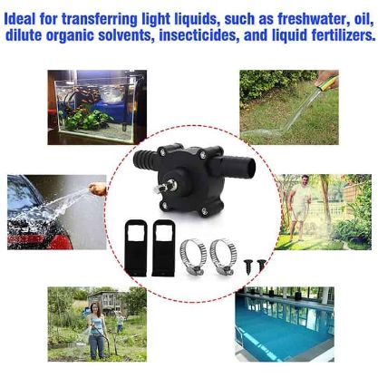 • Високопроизводителна водна помпа се свързва с ръчна бормашина за бързо изпомпване и изливане на течности.