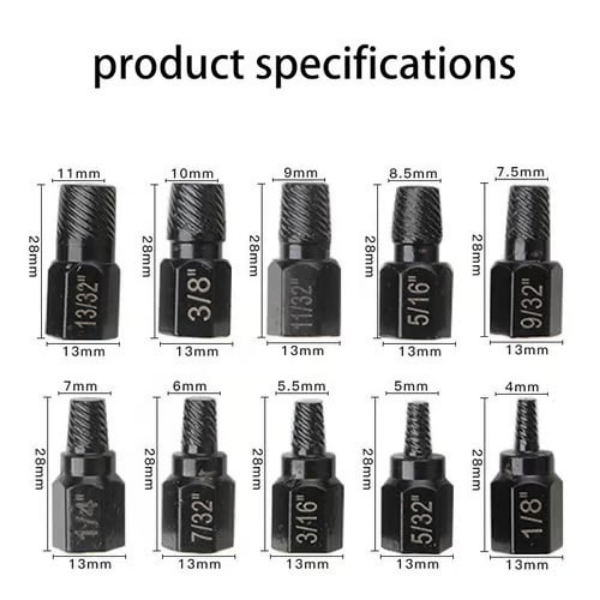 Включва 10 екстрактора за болтове с широк диапазон от размери, гарантирайки, че винаги сте подготвени за различни задачи по изваждане.