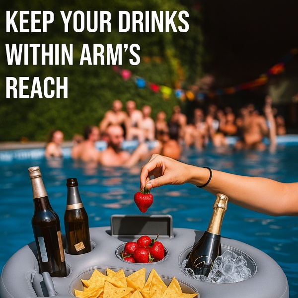 Тази надуваема поставка за напитки и храна поддържа всички необходими неща на една ръка разстояние, което прави релаксацията край басейна още по-лесна.
